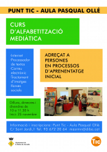 El Punt TIC-Aula Pasqual Ollé organitza una nova edició del Curs d'Alfabetització mediàtica on les persones participants podran aprendre diferents eines com processador de textos, aprendre a utilitzar el correu electrònic, tractament d'imatges, xarxes socials, etc.