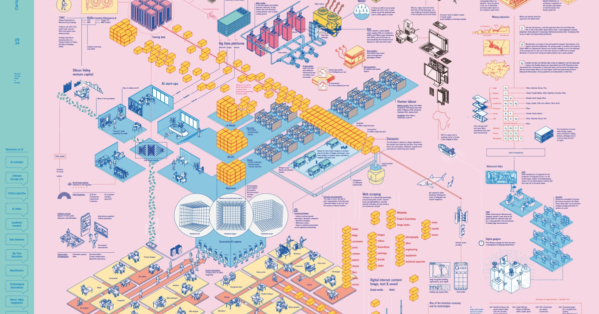 We generate images and texts with a single click, but... do we really know what lies behind these technologies? The installation "Cartography of Generative AI" proposes a critical look at the hidden costs of artificial intelligence , from physical infrastructures and energy consumption to the social and environmental impact that often goes unnoticed.