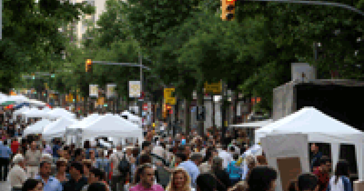 Carrer ple de gent i paradetes, a la Fira d'Entitats de Sants