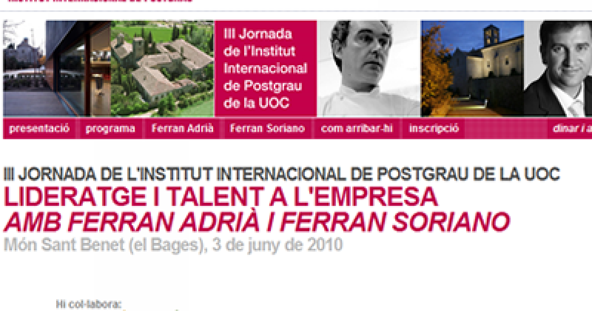 Dijous 3 de juny l'Institut Internacional de Postgrau de la Universitat Oberta de Catalunya organitza la jornada Lideratge i talent a l'empresa, amb la participació de cuiner Ferran Adrià i l'empresari Ferran Soriano.