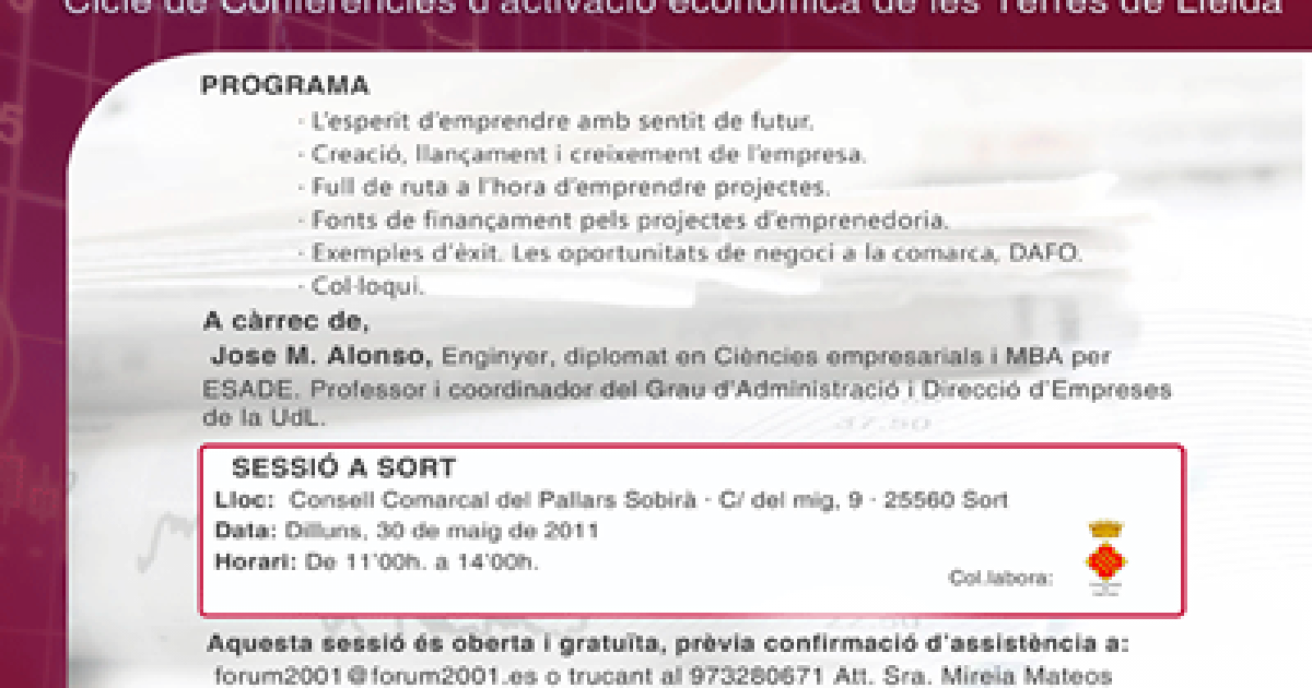 Dilluns 30 de maig el Punt TIC dePallars Sobirà, a Sort, organitza la jornada "Aprenem a emprendre", dins el cicle de conferències d'activació econòmica de les Terres de Lleida. La xerrada anirà a càrrec de Jose M. Alonso, professor i coordinador del Grau d'Administració i Direcció d'Empreses de la Universitat de Lleida (UdL).