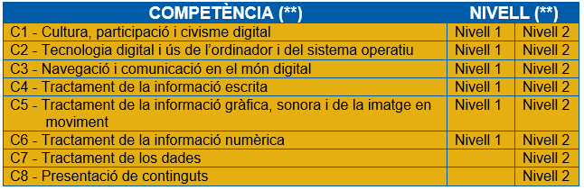 The training offer includes the following skills, being able to perform them individually, several, or even all skills of the same level. The contents follow the homologation of the ACTIC accreditation, in its initial and intermediate levels, and therefore, can be used to prepare for the official examinations of the ACTIC accreditation model, which is promoted by the Generalitat de Catalunya.