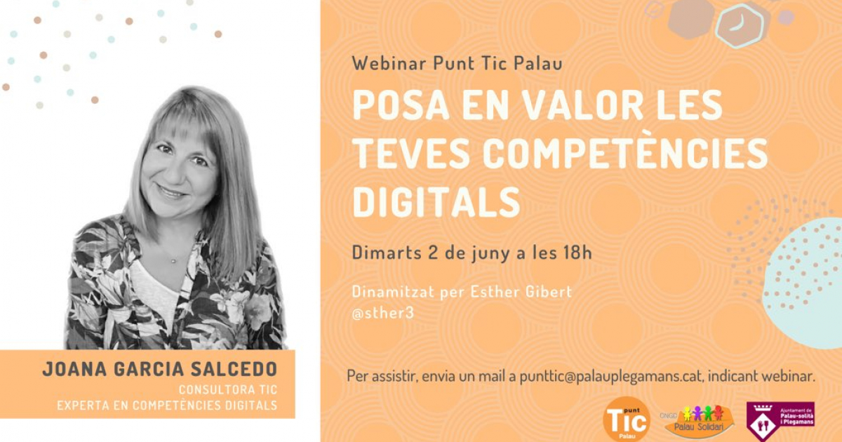 El dimarts 2 de juny a les 18 h. Joana Garcia Salcedo, consultora TIC i experta en competències digitals, oferirà un webinar on explicarà què són les competències digitals, com les posem en pràctica i ens ensenyarà eines i recursos per desenvolupar-les. La sessió estarà dinamitzada per Esther Gibert, dinamitzadora del Punt TIC Palau.