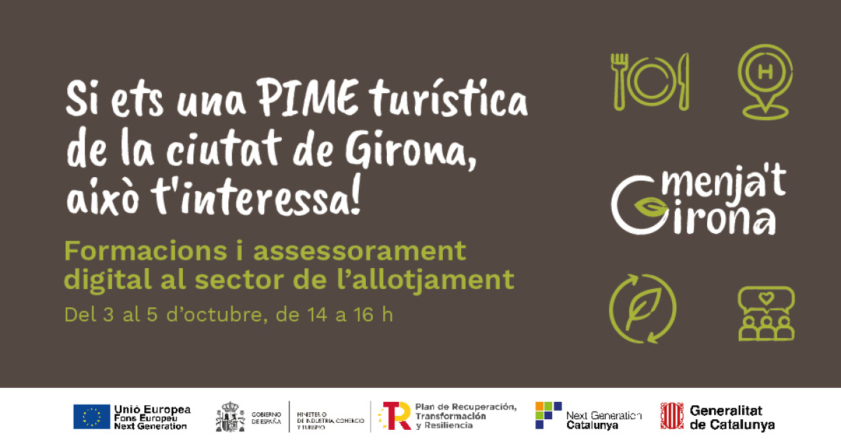 El Punt TIC del Servei Municipal d'Ocupació de l'Ajuntament de Girona dinamitzarà una formació de tres dies de durada (3, 4 i 5 d'octubre de 14 a 16 hores) dirigida al sector de l'allotjament de Girona. La primera sessió tractarà de la ciberseguretat. La segona sessió tractarà de l'estratègia de preus. La tercera sessió tractarà de les campanyes de SEM. Les formacions es podran seguir presencialment al Punt TIC del Servei Municipal d'Ocupació de Girona o telemàticament. Aquesta formació s'organitza en el marc del projecte Menja't Girona, que s'emmarca dins la convocatòria Plans de Sostenibilitat Turística en Destinacions finançada amb el Plan de Recuperación, Transformación y Resiliencia (ProyectosPRTR) finançat per la Unió Europea - NextGenerationEU.