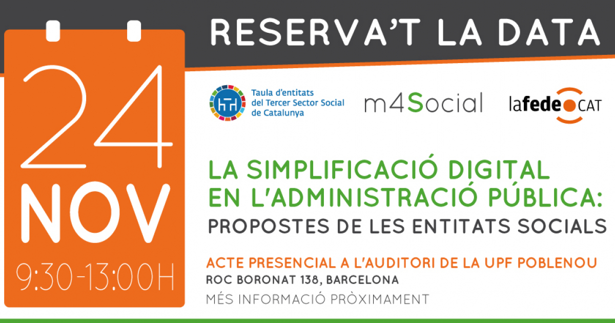 m4Social organitza en col·laboració amb Lafede.cat – Organitzacions per a la Justícia Global la jornada ‘La simplificació digital en l’administració pública: propostes de les entitats socials’, que tindrà lloc el proper dijous 24 de novembre de 9.30 a 13.00 h a l’Auditori de la Universitat Pompeu Fabra Poblenou (Carrer Roc Boronat, 138, Barcelona).